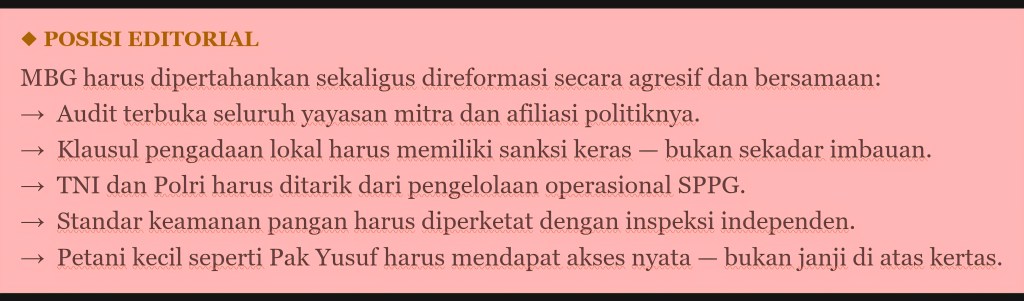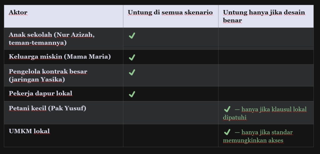 Tabel ini adalah inti dilema yang sesungguhnya. Anak sekolah seperti Nur Azizah dan keluarga miskin seperti Mama Maria untung di semua skenario, bahkan yang terburuk sekalipun. Tapi petani kecil seperti Pak Yusuf hanya untung jika desainnya benar dan pengawasannya dijalankan. Program yang sama bisa menjadi mesin ekonomi desa atau sekadar jalur distribusi elite, tergantung pada satu hal yang tidak seksi untuk diberitakan: kepatuhan pada klausul pengadaan lokal.