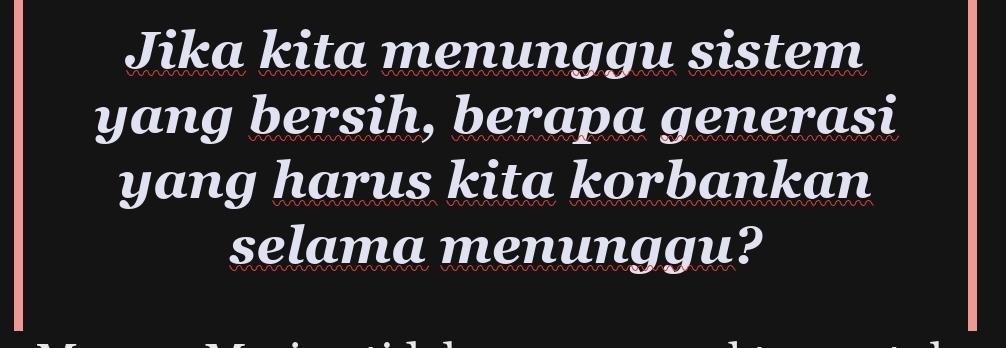 Indonesia tidak kekurangan visi. Yang selalu kurang adalah keberanian untuk membersihkan budaya yang merusak segala program, proyek, dan sistem. Mari jalankan yang tidak